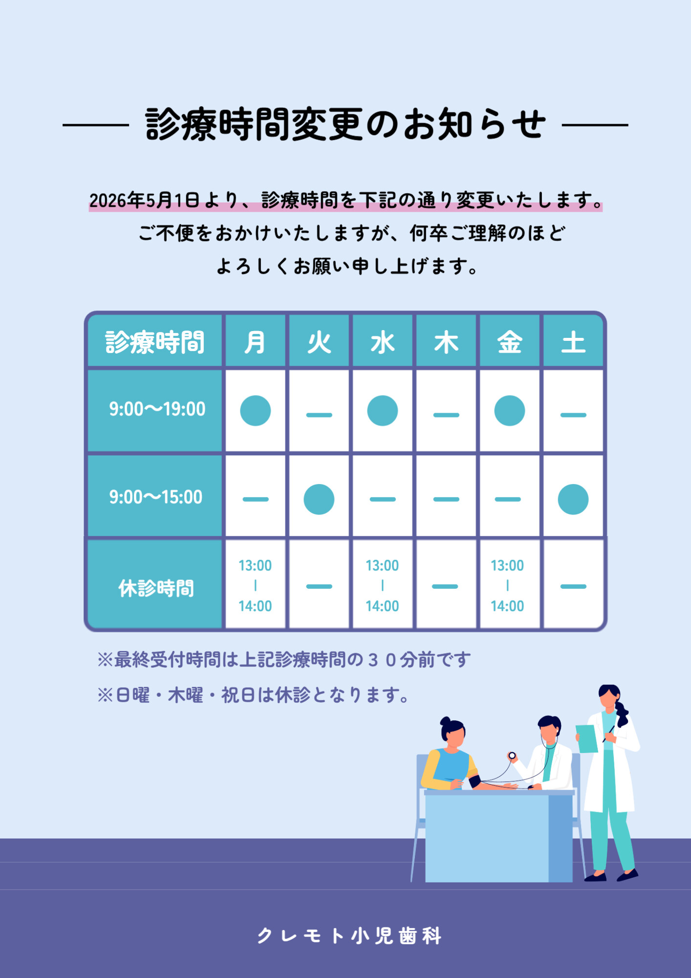 2026年5月1日より、診療時間を下記の通り変更いたします🙇