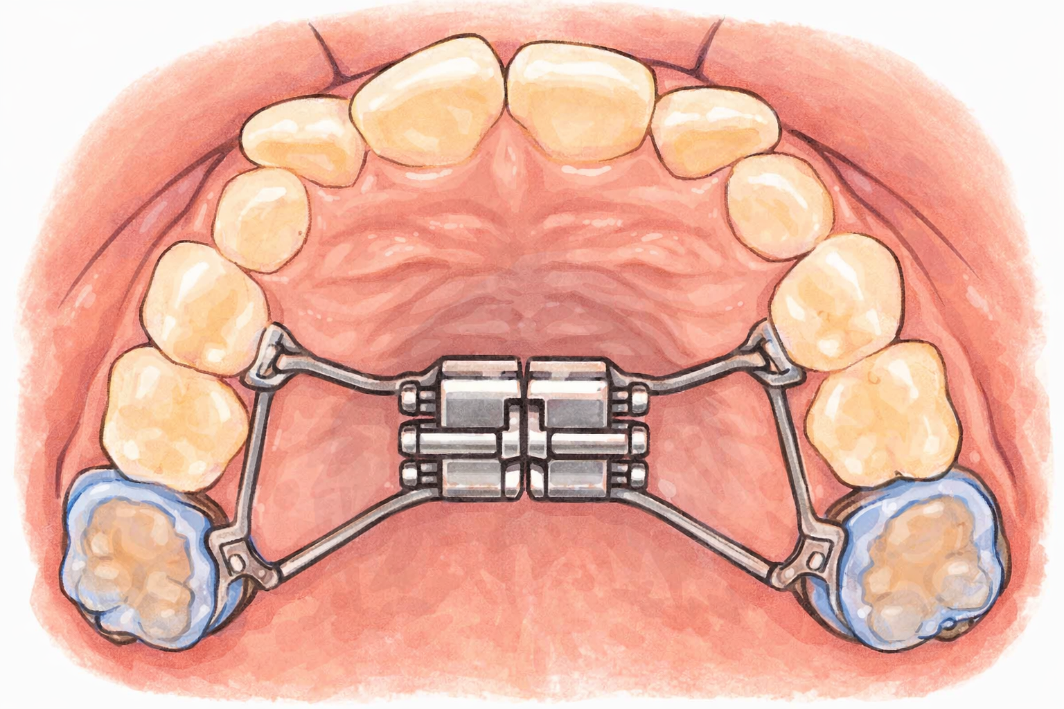 歯が並ぶスペースを作るために使われる矯正装置の多くは、 上あごの内側(口の中の天井側)に装着されます。