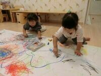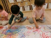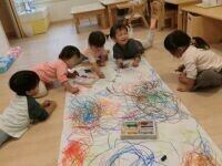 クレヨンを握って「ここに描こうかな?」「つぎはこの色!」と、思い思いに線や色を重ねていく子どもたち。