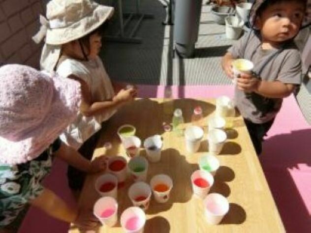 今日はテラスで色水遊びを行いました。透明なカップにきれいな色のお水を入れて、「リンゴジュースどうぞ!」と元気いっぱいにジュース屋さんごっこを楽しむ子どもたち。