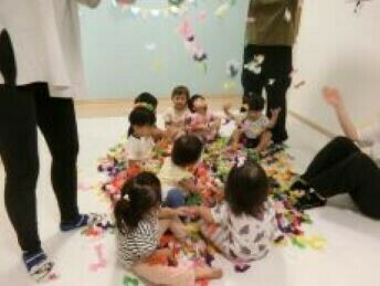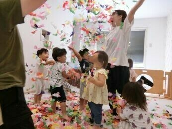 保育士の出し物では、お花紙を使った遊びを楽しみました。